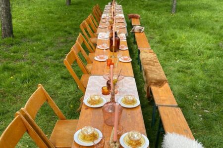 Een diner onder de veranda in warme pasteltinten met onwijs veel aardewerken vaasjes om uit te kiezen. Of lange tafels achter elkaar in een boomgaard met vintage glaswerk zoals koraalkleurig persglas en kristal. Verse bloemen, grassen of droogbloemen, tafellopers en messing kaarsenstandaards. We stylen de tafels zoals jullie het willen.
